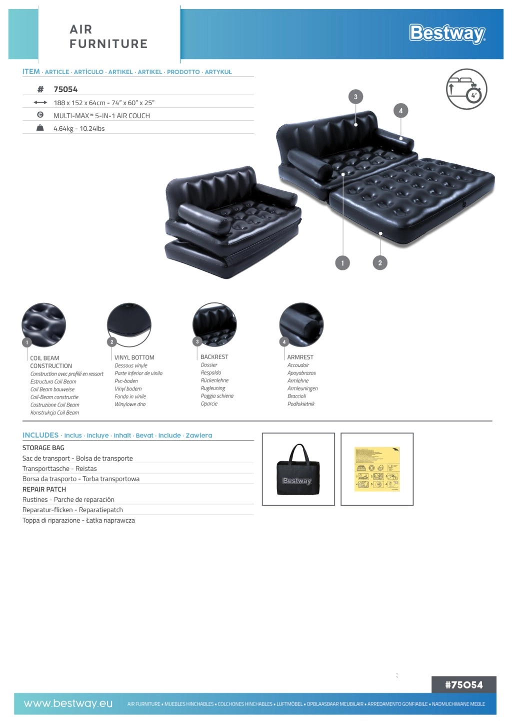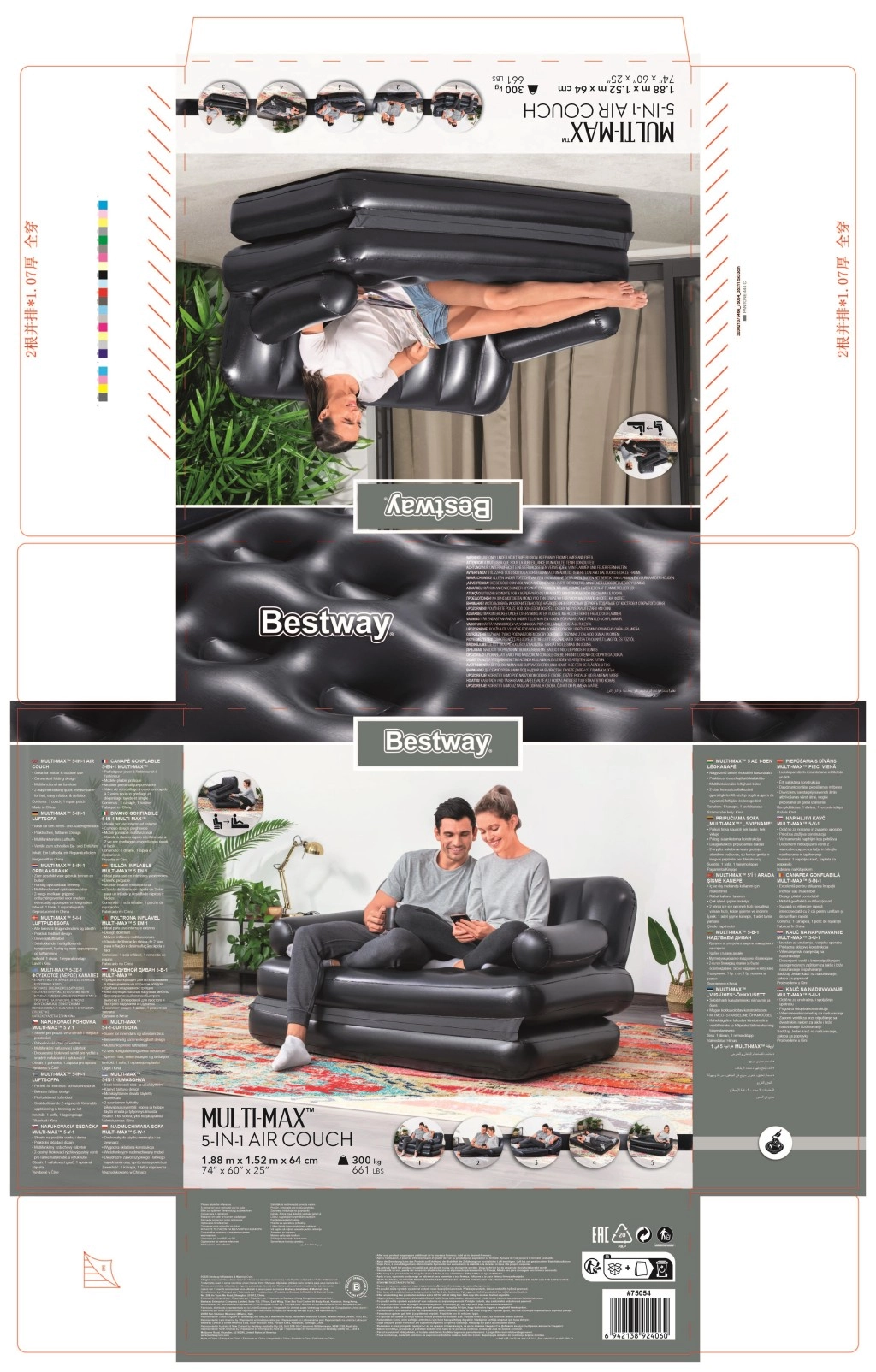 Das aufblasbare Sofa BESTWAY 5-in-1 ist die ideale Lösung für Wohnzimmer, Gästezimmer oder Studentenwohnungen. Dank des cleveren modularen Designs verwandeln Sie es im Handumdrehen von einem bequemen Zweisitzer-Sofa in eine Liege oder ein vollwertiges Doppelbett. Die samtig weiche Oberfläche mit Kammern erhöht den Komfort beim Sitzen und Schlafen.