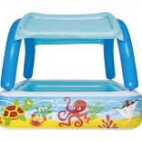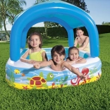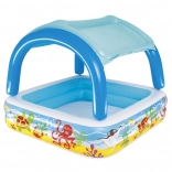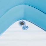 Dieses aufblasbare Kinderbecken der Marke Bestway besteht aus langlebigem Vinylmaterial, das langanhaltenden Spaß und Sicherheit beim Spielen gewährleistet. Der Pool enthält zwei separate aufblasbare Ringe, die Stabilität und Sicherheit bieten, während der aufblasbare Baldachin die Kinder vor schädlichen Sonnenstrahlen schützt. Das Paket enthält auch ein wasserfestes Reperaturpflaster, mit dem der Pool auch im Wasser repariert werden kann.