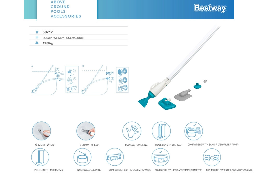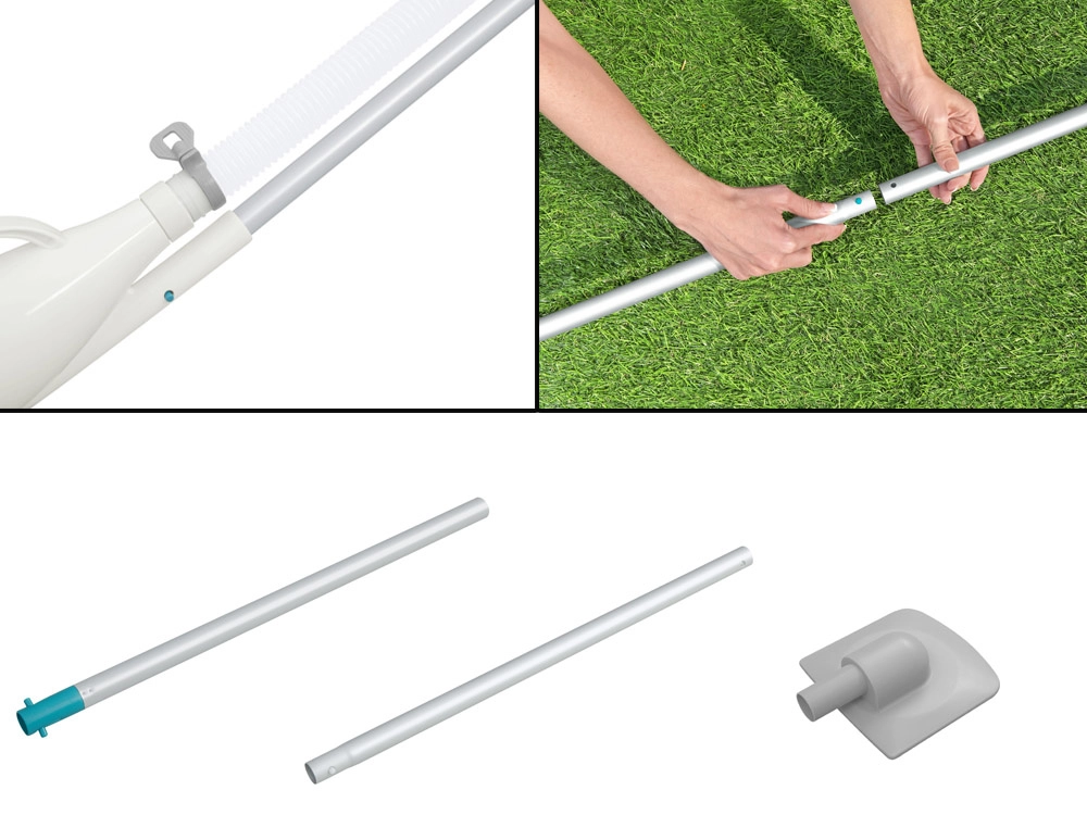 Griff mit 1,9 m Länge und 6 m langer Saugschlauch für eine einfache Reinigung der Pooloberflächen.