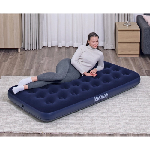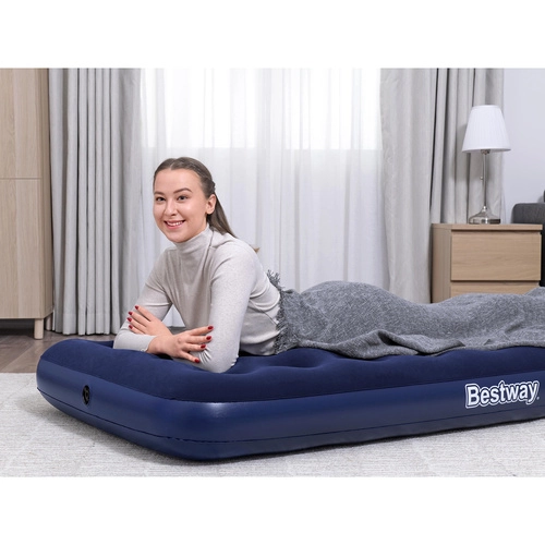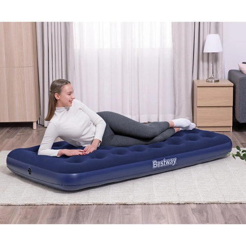 Genießen Sie erholsamen Schlaf überall. Das aufblasbare BESTWAY Einzelbett kombiniert robustes PVC mit angenehmem Velours für komfortables Liegen ohne rutschende Bettwäsche. Die innere Coil-Beam-Konstruktion verteilt das Gewicht gleichmäßig und gewährleistet Stabilität die ganze Nacht.