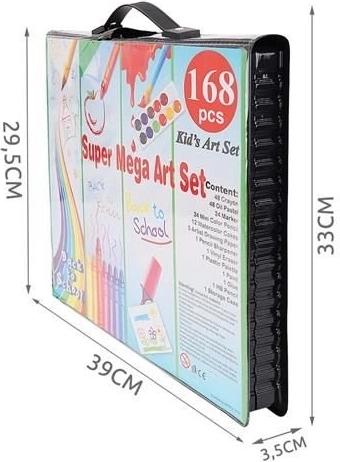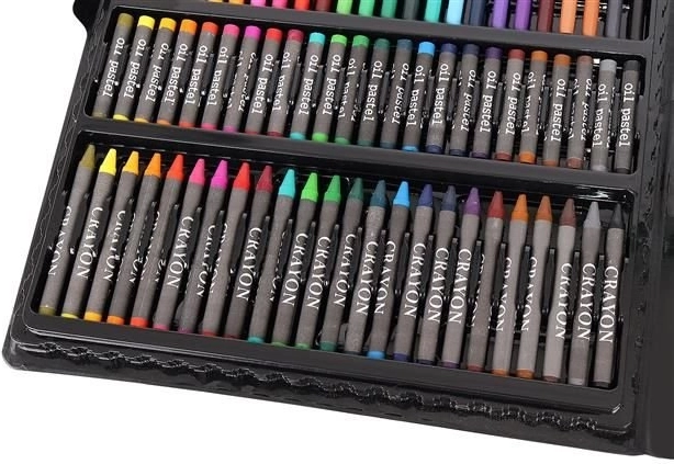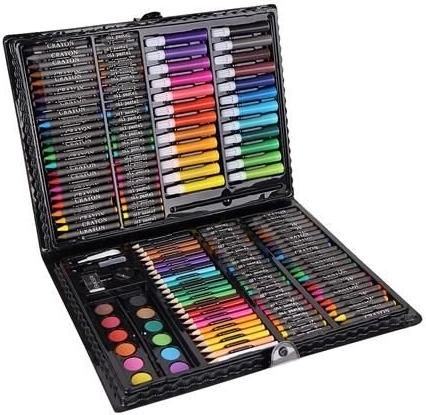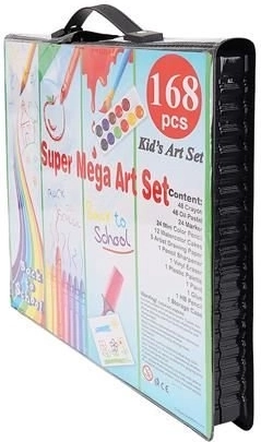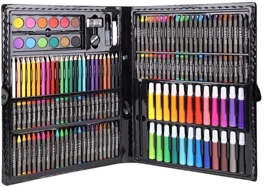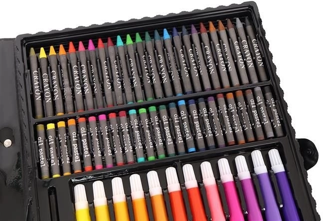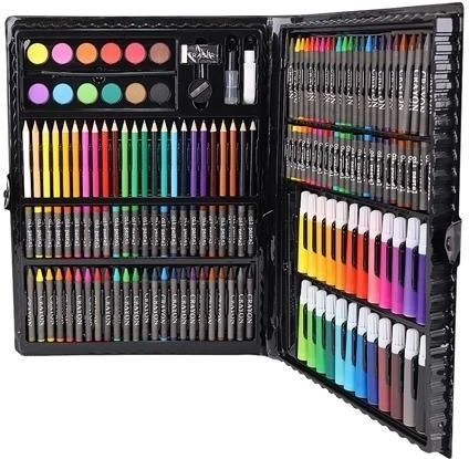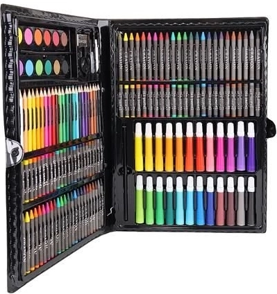 Das Super Mega Kunstzubehörset 168-teilig bietet alles, was Sie für die Erstellung von Kunstwerken benötigen: 24 Buntstifte, 24 Filzstifte, 48 Ölkreiden, 48 Wachsmalkreiden, 12 Aquarellfarben und vieles mehr. Alle Utensilien sind elegant in einem praktischen Etui organisiert, was einen einfachen Zugang und Übersichtlichkeit gewährleistet.
