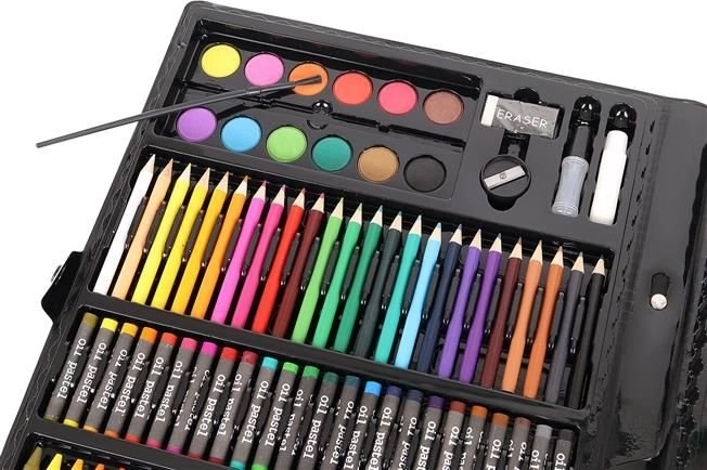 Das Set enthält eine breite Auswahl an Kunstzubehör, von Buntstiften bis hin zu Aquarellfarben, was es ideal für verschiedene kreative Projekte macht.