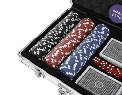 Im Lieferumfang enthalten sind außerdem Funktionschips DEALER, SMALL BLIND und BIG BLIND für eine übersichtliche Organisation des Spiels, 2× 54 Karten für eine flüssige Deck-Rotation sowie 5 Würfel für zusätzlichen Spielspaß am Tisch. Das Set ist ideal für Heimspielräume, Partys und freundschaftliche Duelle.