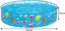 Die Spezifikationen des Pools umfassen eine Kapazität von 277 Litern und die Maße 122 cm x 25 cm, was ideal für kleine Kinder ist. Das Produkt wiegt nur 950 g, ist also leicht zu handhaben und tragbar. Im Lieferumfang ist auch ein wasserdichter Reparaturflicken enthalten, der schnelle Reparaturen ermöglicht, selbst wenn der Pool mit Wasser gefüllt ist.