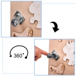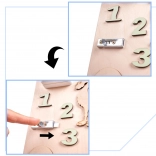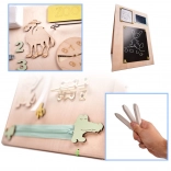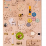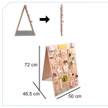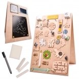 Eine einzigartige Funktion dieses Boards ist seine Zweiseitigkeit - eine Seite enthält viele manipulierte Elemente, die andere dient als Fläche zum Zeichnen und Schreiben mit Kreide, Markern oder Stiften. Dies hilft Kindern, Kreativität und Feinmotorik zu entwickeln.