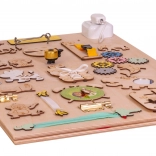 Das Board enthält farbenfrohe Zahnräder, Glocken, Schlösser und weitere interaktive Elemente, die die Entwicklung der Feinmotorik fördern.