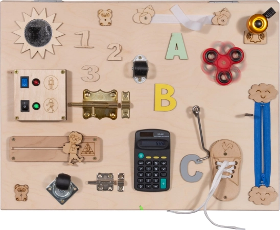Enthält verschiedene Elemente wie Schlösser, Karussells und einen Taschenrechner, die die Feinmotorik und kognitive Fähigkeiten fördern.