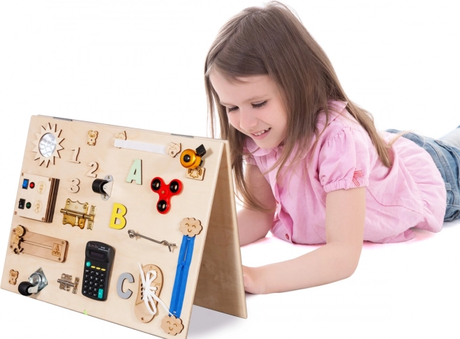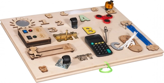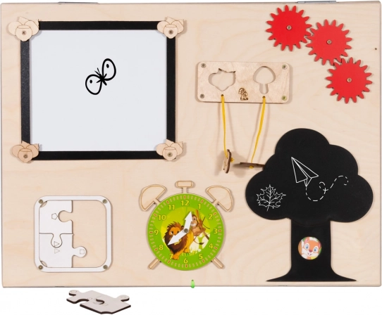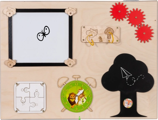 Dieses multifunktionale Holzspielbrett ist voll von verschiedenen Spielelementen, die Kindern helfen, ihre Fähigkeiten zu entwickeln. Kinder können mit verschiedenen interaktiven Mechanismen spielen, die stundenlangen Spaß garantieren.