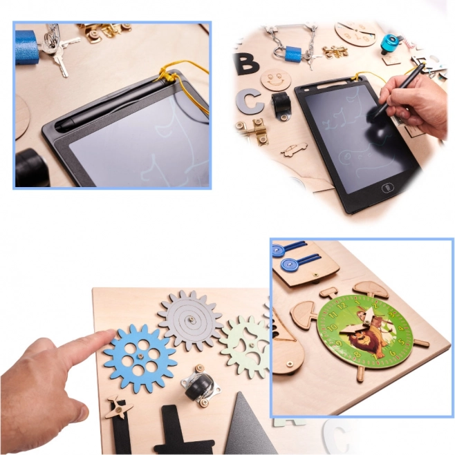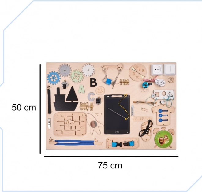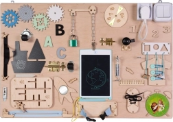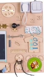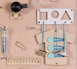Das Brett enthält verschiedene interaktive Elemente wie Schalter, Reißverschlüsse und andere Kleinigkeiten, die Kinder sicher nutzen können, um zu lernen und Spaß zu haben.