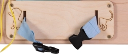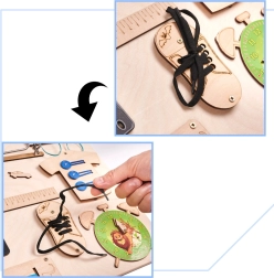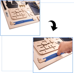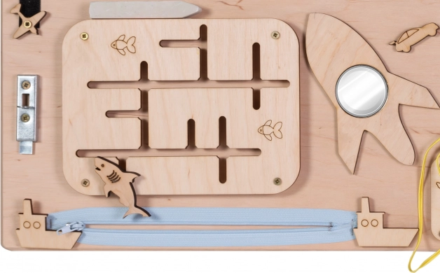 Das Spiel auf dem Brett fördert die Feinmotorik und die Hand-Auge-Koordination durch verschiedene Bewegungsaufgaben wie Schnürung oder Radmanipulation.