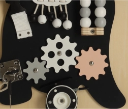Durch interaktive Elemente wie Zahnräder, Schlösser und Schnürsenkel lernen Kinder die Feinmotorik und verbessern ihre Handsicherheit.