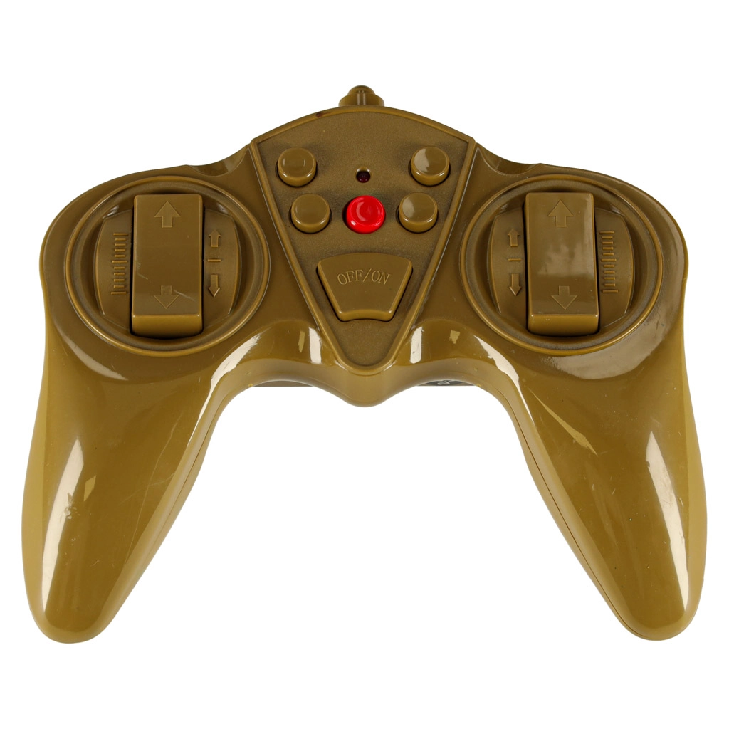Der RC-Panzer im Wüstendesign bietet sanfte Fahrt vorwärts/rückwärts, Drehung auf der Stelle und einen Turm, der jeweils 180° nach links und rechts schwenkt (insgesamt 360° Feuersektor). Weiche Gummiketten sorgen für guten Grip auf verschiedenen Untergründen. Beim Schuss simuliert der Panzer einen realistischen Rückstoß sowie begleitende Motor- und Schussgeräusche.