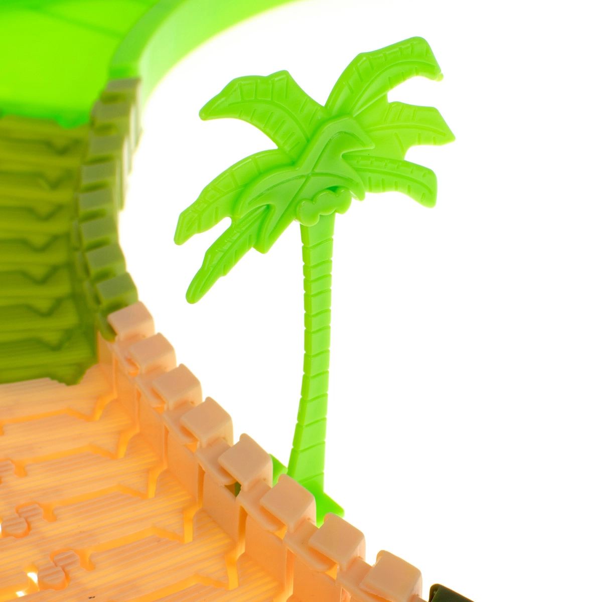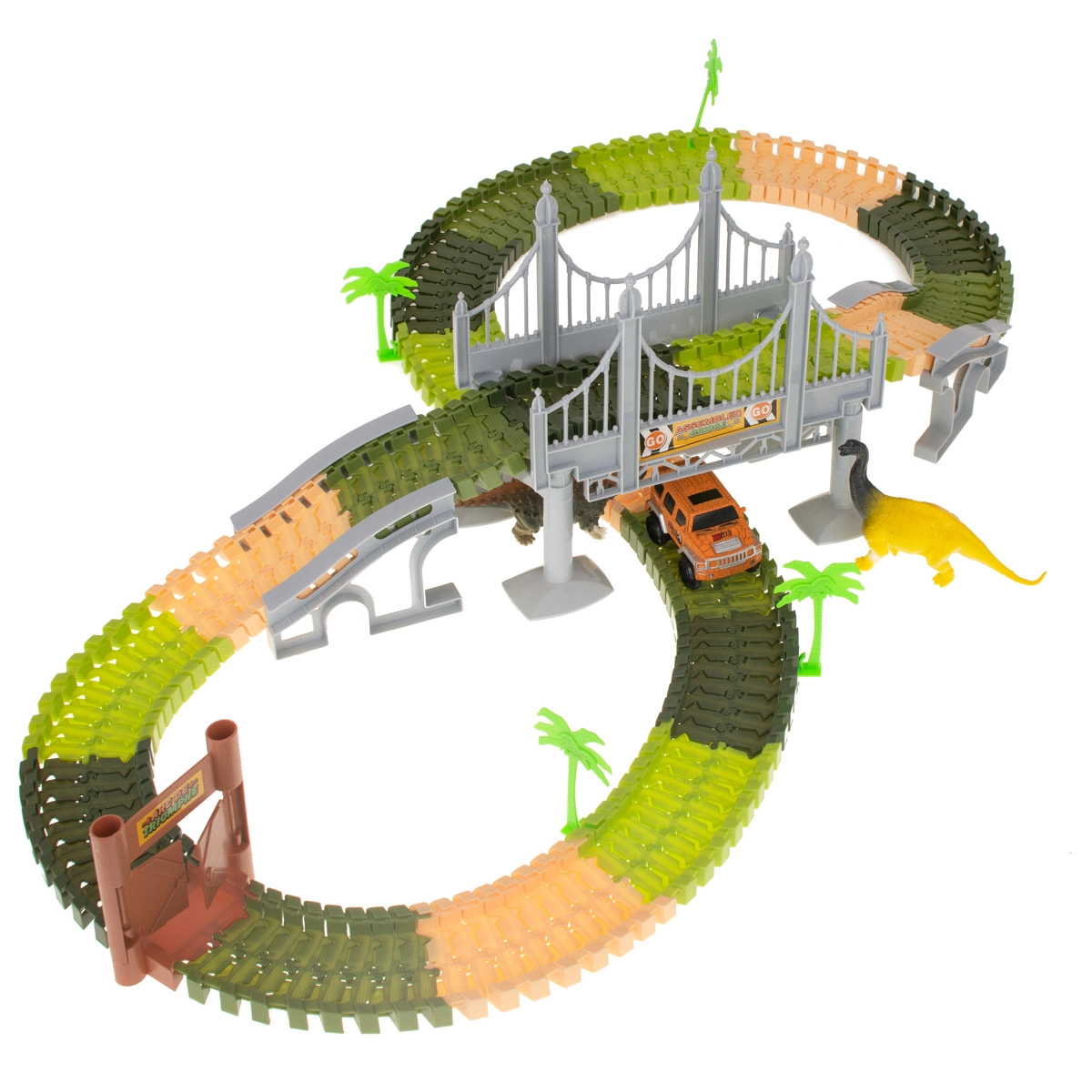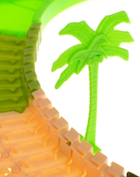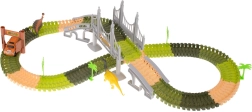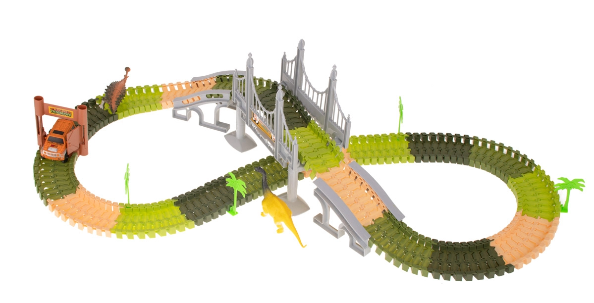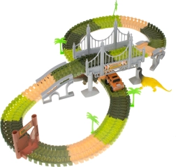 Das Set enthält: 160 Streckenteile, ein Auto, 2 Dinosaurier, 4 Palmen, eine Brücke und ein Tor. Das Auto wird von 1 AA 1,5V Batterie betrieben, die nicht im Lieferumfang enthalten ist. Alle Streckenteile lassen sich leicht zusammenfügen und sind sehr flexibel für verschiedene Formen und Variationen.