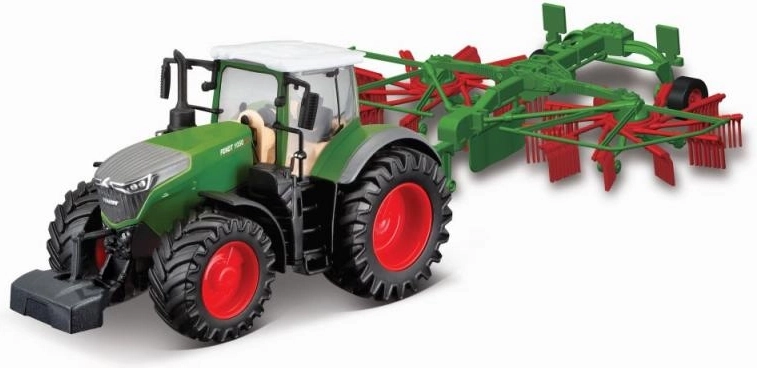 Modell des landwirtschaftlichen Traktors Bburago Farm Traktor Fendt 1050 Vario mit Schwader (Heuwender), hergestellt aus Metall- und Kunststoffteilen, basiert auf dem Vorbild des Traktors, der zur Spitzenserie 1000 Vario gehört.