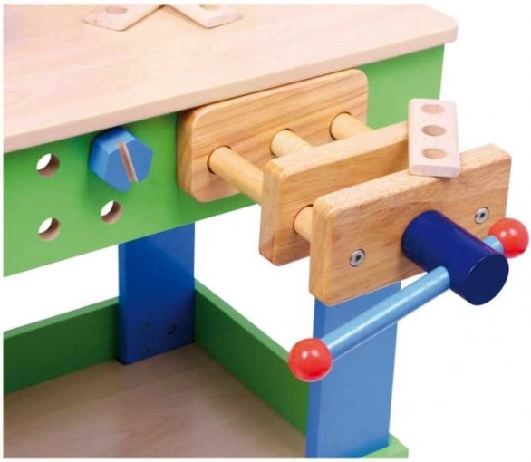 Die Werkbank ist fest verankert und enthält eine Schraubzwinge zur Sicherung der Werkstücke. Kinder können Fähigkeiten wie Hämmern, Schrauben, Messen und Schneiden trainieren.