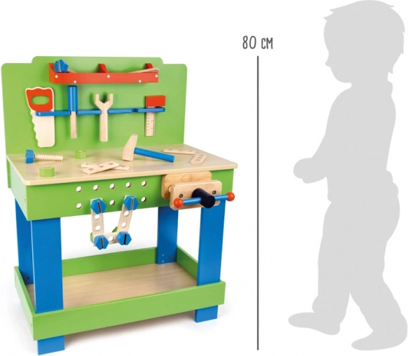 Die Werkbank ist stabil konstruiert, um stundenlanges Spielen zu überstehen und die notwendige Stabilität für einen sicheren Umgang mit Spielzeugen zu bieten.