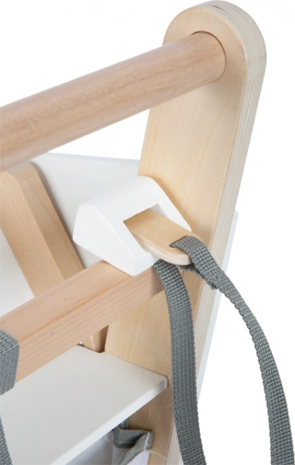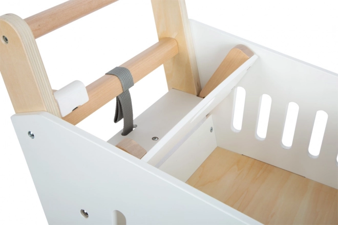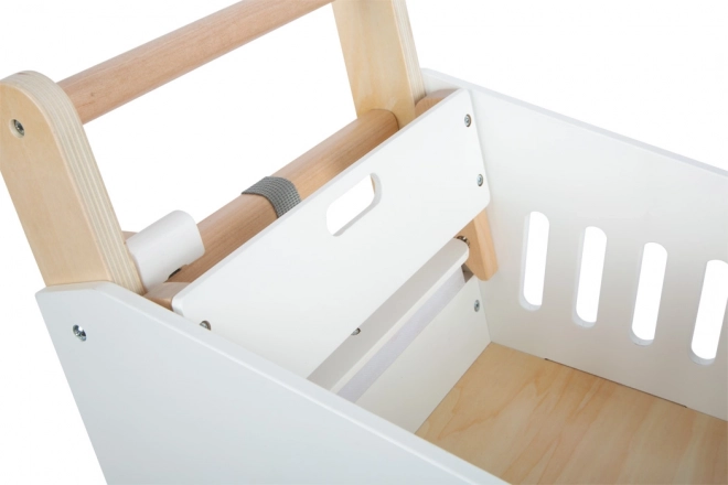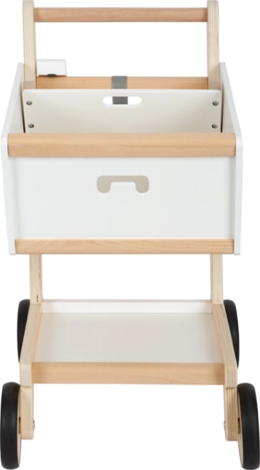 Dieser Kinder-Einkaufswagen ist aus massivem Holz gefertigt und mit gummierten Rädern für eine leise und sanfte Bewegung ausgestattet. Wie in einem echten Supermarkt gibt es die Möglichkeit, einen magnetischen Chip im Halter zu verwenden. Der Wagen bietet einen geräumigen Korb für verschiedene Gegenstände und zusätzlichen Stauraum im unteren Bereich.