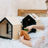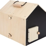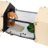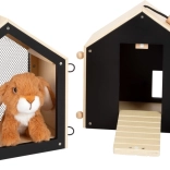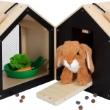 Dieser durchdachte Kaninchenstall aus hochwertigem Holz bietet zwei getrennte Häuschen – eines zum ruhigen Schlafen und eines mit Gitterfenster zum Beobachten der Umgebung. An die Häuschen lassen sich leicht Drahtzäune anbringen, um einen Außenbereich für noch mehr Spielspaß zu schaffen. Die schwarze Rückwand kann mit Kreide beschriftet werden und sorgt für zusätzliche kreative Interaktion.