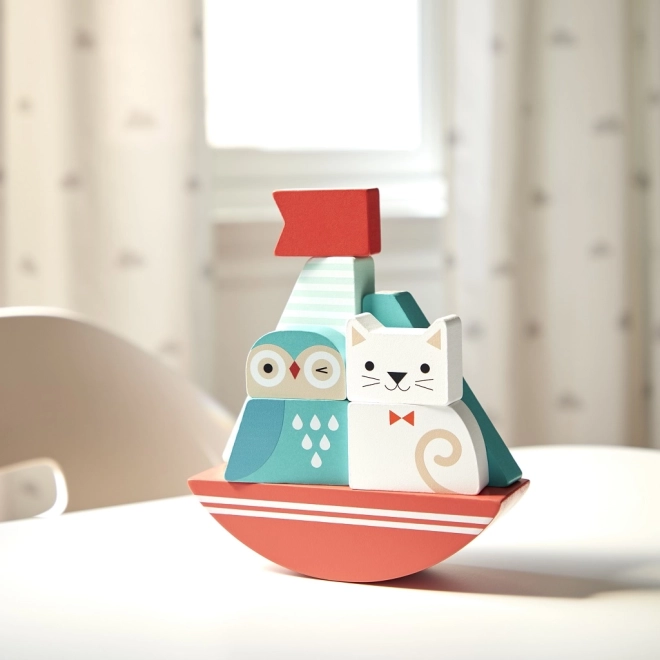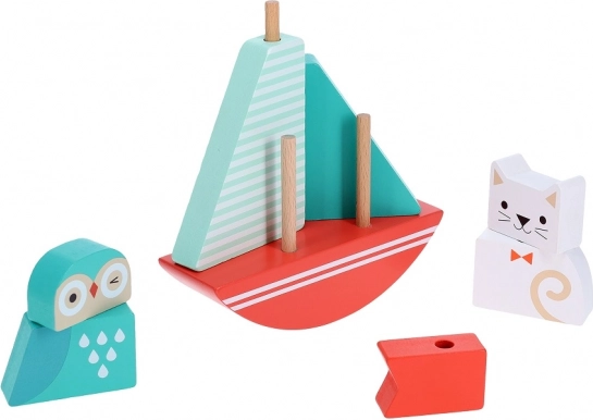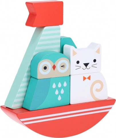 Hurra, gen Horizont! Ein Unterhalter in Form eines Holzspielzeugs mit Eulen- und Katzenmotiv auf einem Schiffchen, das die Feinmotorik und die Hand-Auge-Koordination verbessert. Dieses Spielzeug ist perfekt für die Entwicklung Ihrer Kleinsten dank der bunten Bausteine.
