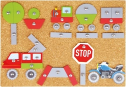 Dieses unterhaltsame und lehrreiche Hammer- und Nagelspiel ist ideal für kleine Konstrukteure. Kinder können eigene Verkehrsmittel entwerfen und sie auf der Korkplatte mit Hammer und Nägeln befestigen. Bunte und bedruckte Teile bieten unzählige Kombinationen und regen die Fantasie an.