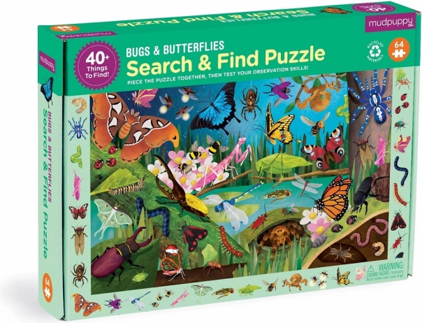 Tauchen Sie ein in die farbenfrohe Welt der Insekten – von der Atlasspinner-Motte über Glühwürmchen bis zu Marienkäfern. Dieses 64-teilige Puzzle verbindet Spaß und Lernen: Zuerst wird ein detailreiches Bild zusammengesetzt, anschließend suchen Kinder im Rahmen rund um die Szene über 40 verschiedene Arten. Dank der matten Oberfläche und der stabilen Rückseite liegen die Teile gut in der Hand und passen präzise zusammen.