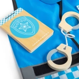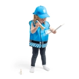 Die blaue Weste mit reflektierenden Elementen und die Mütze mit Emblem sorgen für einen authentischen Polizeilook und fördern soziale sowie kommunikative Fähigkeiten.