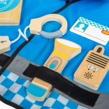 Enthalten sind ein Funkgerät aus Holz, eine Taschenlampe, Handschellen, ein Ausweisabzeichen und eine Dokumentenbörse – sichere und robuste Accessoires für kleine Hände.