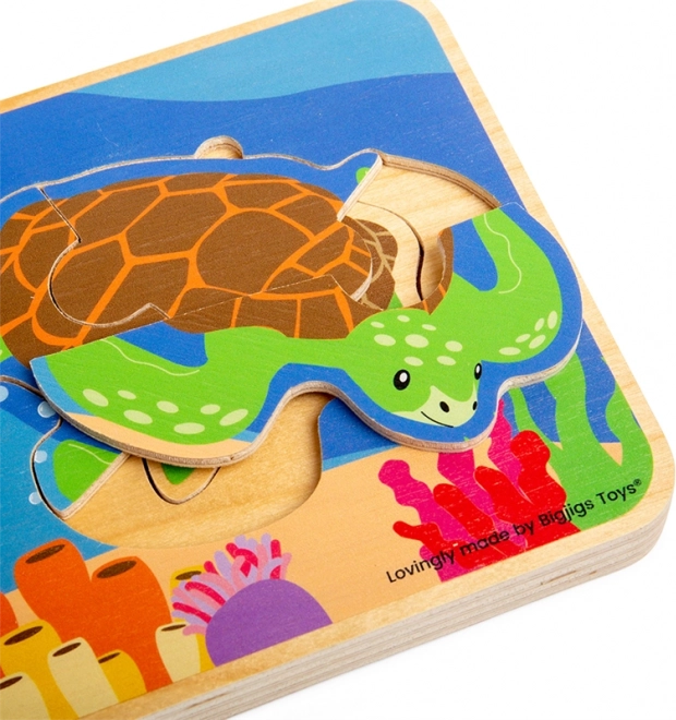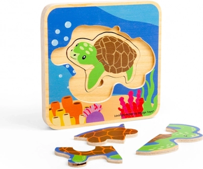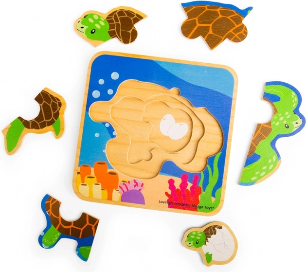 Dieses wunderschön illustrierte Holzpuzzle zeigt Kindern anschaulich, wie eine Schildkröte wächst – vom Ei über das Jungtier bis zur erwachsenen Schildkröte. Die einzelnen Teile werden der Größe nach eingesetzt, sodass Kinder Schritt für Schritt die nächste Entwicklungsphase entdecken.