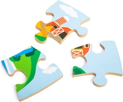 Die Größe von 40 × 40 cm bietet ausreichend Platz für gemeinsames Puzzeln mit den Eltern und für das selbstständige Spiel. Die glatten Holzteile liegen gut in der Hand, sind robust und sicher für kleine Baumeister ab 3 Jahren.
