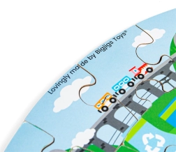 Das hochwertige Holzpuzzle in runder Form ist eine hervorragende Wahl für erste Lernpuzzles. Dank klarer Farben und ansprechender Szenen aus Stadt und Natur finden sich Kinder leicht im Thema Abfalltrennung und Umweltschutz zurecht.