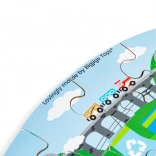 Das hochwertige Holzpuzzle in runder Form ist eine hervorragende Wahl für erste Lernpuzzles. Dank klarer Farben und ansprechender Szenen aus Stadt und Natur finden sich Kinder leicht im Thema Abfalltrennung und Umweltschutz zurecht.