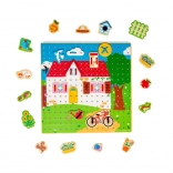 Die Fädelplatte Haus BIGJIGS TOYS ist ein ideales Aktivspielzeug für Kinder ab 3 Jahren. Dank der perforierten Holzplatte und der bunten Schnüre können Kinder aus den einzelnen Teilen immer neue Szenen gestalten – von kleinen Fenstern und Blumen bis hin zu einem Rad oder Wolken. So trainieren sie ganz natürlich Feinmotorik, Augen-Hand-Koordination und Konzentration.