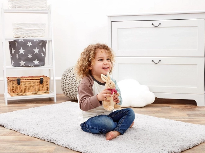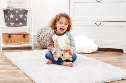 Das Plüschhäschen Flopsy besteht aus hochwertigen, besonders weichen Stoffen, die sich angenehm anfühlen und sanft zur Kinderhaut sind. Der freundliche Ausdruck, die langen Ohren und die kontrastierende Schleife machen es zum beliebten Begleiter für die Nacht und auf Reisen.