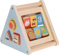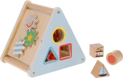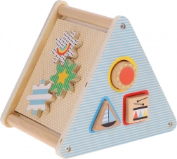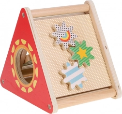 Das Spielzeug enthält verschiedene ausgeschnittene Öffnungen für das Einfügen von Formen und Zahnräder zur Förderung der Feinmotorik.