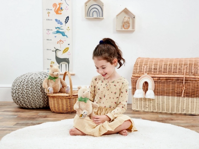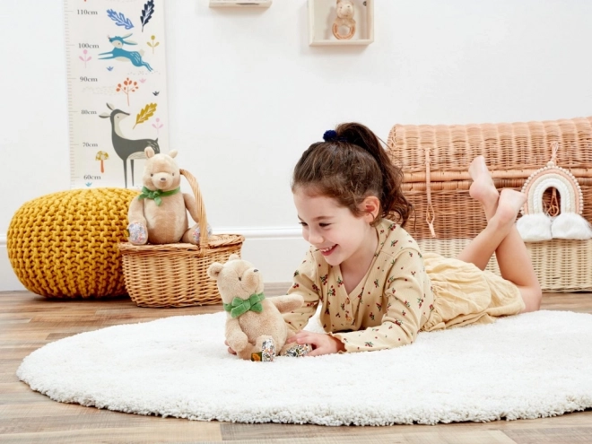 Der Bär wurde mit Blick auf den Planeten entworfen – die verwendeten Materialien sind nachhaltig, und die Füllung besteht aus Fasern recycelter Plastikflaschen. Ein stylischer grüner Schal mit Schleife und das feine Waldmuster auf den Pfoten verleihen ihm einen zeitlosen Look, der Kinder wie Eltern erfreut. Geeignet ab der Geburt, ideal als Geschenk zur Geburt.