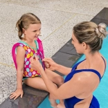 Diese rosa Schwimmweste für Kinder ist entworfen, um kleinen Schwimmern zu helfen, sich im Wasser sicher und fröhlich zu fühlen. Die Weste besteht aus strapazierfähigem Textil mit UPF 50+, das Ausbleichen verhindert, und enthält Schaumstoffeinlagen für ausgeglichenen Auftrieb.