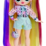 Eine farbenfrohe Puppe mit mehrfarbigen Haaren, modischer Kleidung und auffälligen Accessoires wie Ohrringen mit der Aufschrift 'STUNNER'.
