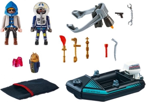 Alles ist bereit für die Aktion in Playmobil City Action. Der Polizist mit dem Jetpack nähert sich schnell dem Dieb, der mit gestohlener Kunst auf dem Boot flieht. Dank seiner Klugheit und Ausrüstung kann der Offizier den Verbrecher schnell überwältigen und die wertvollen Gegenstände ins Museum zurückbringen.