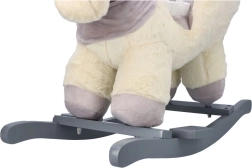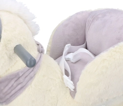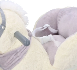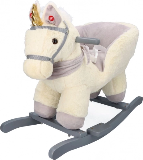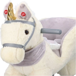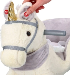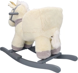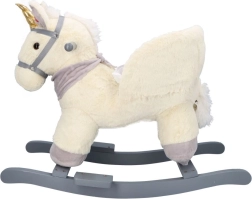 Dieses plüschige Schaukel-Einhorn mit goldenem Horn und dezenten grauen Details ist die ideale Wahl für Spielspaß zu Hause. Der weiche Sitz mit Armlehnen und Sicherheitsgurt bietet Komfort und Stabilität, während Holzkufen und Haltegriffe eine sichere, gleichmäßige Bewegung ermöglichen.