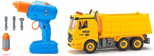 Das Set enthält Kunststoffteile des Fahrzeugs und Räder zur eigenen Montage. Kinder bauen das Fahrzeug zusammen und können sofort zur Baustelle starten.