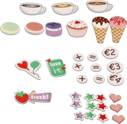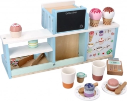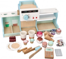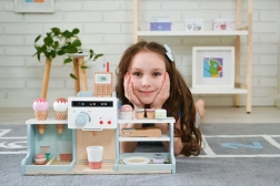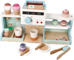 Dieses hölzerne Eiscafé und die Kaffeebar bieten Kindern ein authentisches Erlebnis beim Betreiben eines kleinen Bistros. Dank farbenfrohem Zubehör, drehbaren Knöpfen und realistischen Elementen an Kaffeemaschine und Eistand trainieren Kinder Feinmotorik, Kommunikation und Vorstellungskraft.