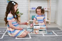 Kinder können „Espresso“ zubereiten, Knöpfe drehen und Gäste bedienen wie in einem kleinen Café. Perfekte Grundlage für das Barista-Rollenspiel.