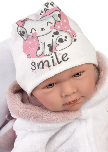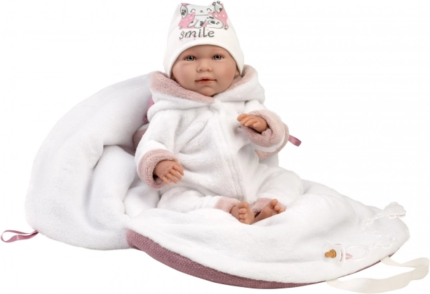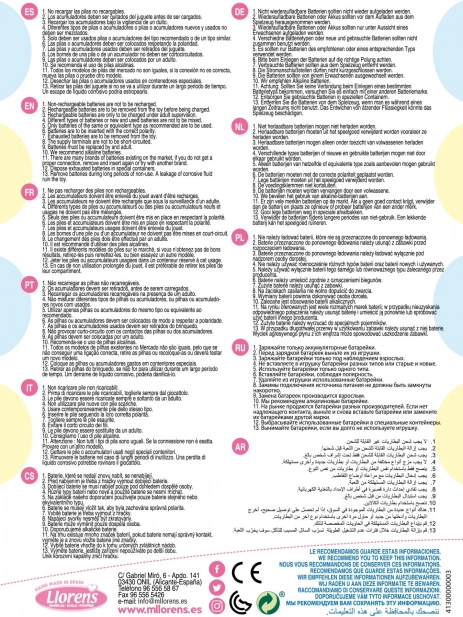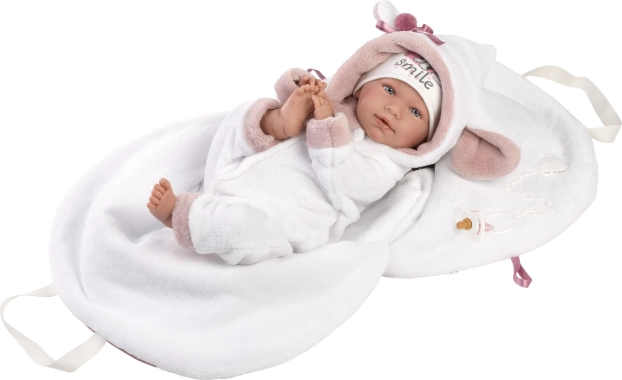 Sprechendes Baby mit weichem Stoffkörper, das beim Drücken auf die Brust „Mama“, „Papa“ sagt und realistische Baby-Weinlaute von sich gibt. Arme und Beine sind gelenkig am Körper befestigt. Das Baby ist positionierbar und kann auch sitzen. Der im Set enthaltene Schnuller dient nur als Zubehör. Größe 42 cm. Handgefertigt in Spanien, verpackt in einer Geschenkbox. Empfohlenes Alter ab 3 Jahren. Für das Baby kann zusätzlich originale Kleidung aus dem Llorens-Sortiment für NEW BORN in den Größen 40–42 cm oder 43–45 cm dazugekauft werden. Im Lieferumfang enthalten sind 3 x Knopfzellenbatterien LR44 mit Anleitung zum Batteriewechsel. Batterien sind Verbrauchsmaterial, daher stellt ihre Entladung keinen Reklamationsgrund für die Puppe dar.