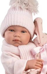 Die Puppe kann mit Vorsicht bei den Wimpern gebadet werden. Enthalten sind ein Schnuller und weiche rosafarbene Kleidung mit Decke.
