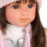 Die Puppe wird in ein stilvolles Winter-Outfit gekleidet, das einen gestrickten Hut, eine Jacke und Schuhe umfasst – alles farblich aufeinander abgestimmt und mit Fokus auf modische Akzente.