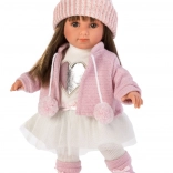 Das Set enthält einen niedlichen rosa gestrickten Hut und eine gefütterte Jacke für Winterspaziergänge, ergänzt durch stilvolle Schühchen mit Pompons. Abgerundet wird der Look durch ein weißes Kleid mit einem glitzernden silbernen Herz auf der Brust und einem Tüllrock. Das komplette Outfit ist ideal für den Alltag und besondere Anlässe.
