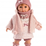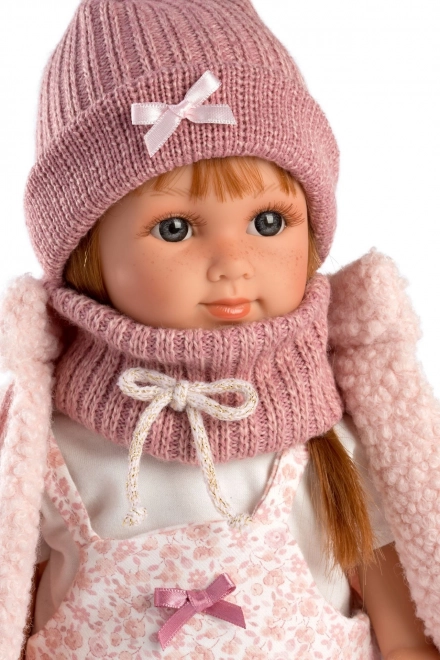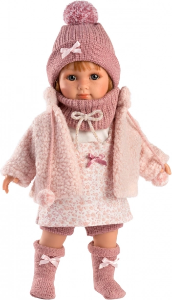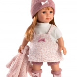 Die Puppe trägt ein Blumenkleid, ergänzt durch einen gestrickten Hut und warme Socken, was einen lebendigen und fröhlichen Look kreiert.