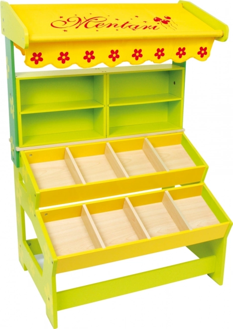 Unterstützen Sie Ihre Kinder beim Erlernen gesellschaftlicher Gebräuche und der Entwicklung kommunikativer sowie mathematischer Fähigkeiten mit diesem modernen Verkaufsstand. Der Stand verfügt über eine textile Markise mit roten Blüten. Lieferung ohne Dekoration und Zubehör.