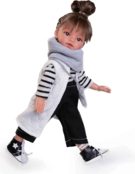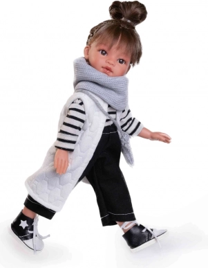 Die Puppe Emily der Marke Antonio Juan ist aus Vinyl gefertigt, was ihr ein realistisches Aussehen und haptische Eigenschaften verleiht. Sie hat Haare über den ganzen Kopf und ist in detailreicher Kleidung gekleidet, die teilweise aus biologischer Baumwolle besteht, die ohne chemische Behandlung angebaut wurde.