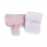 Im Set enthalten sind eine nachfüllbare Flasche und zwei Einwegwindeln – alles, was Kinder zum Füttern und Wickeln brauchen.